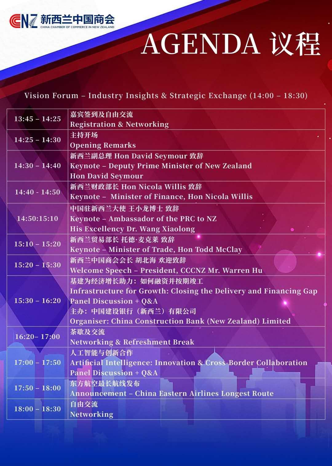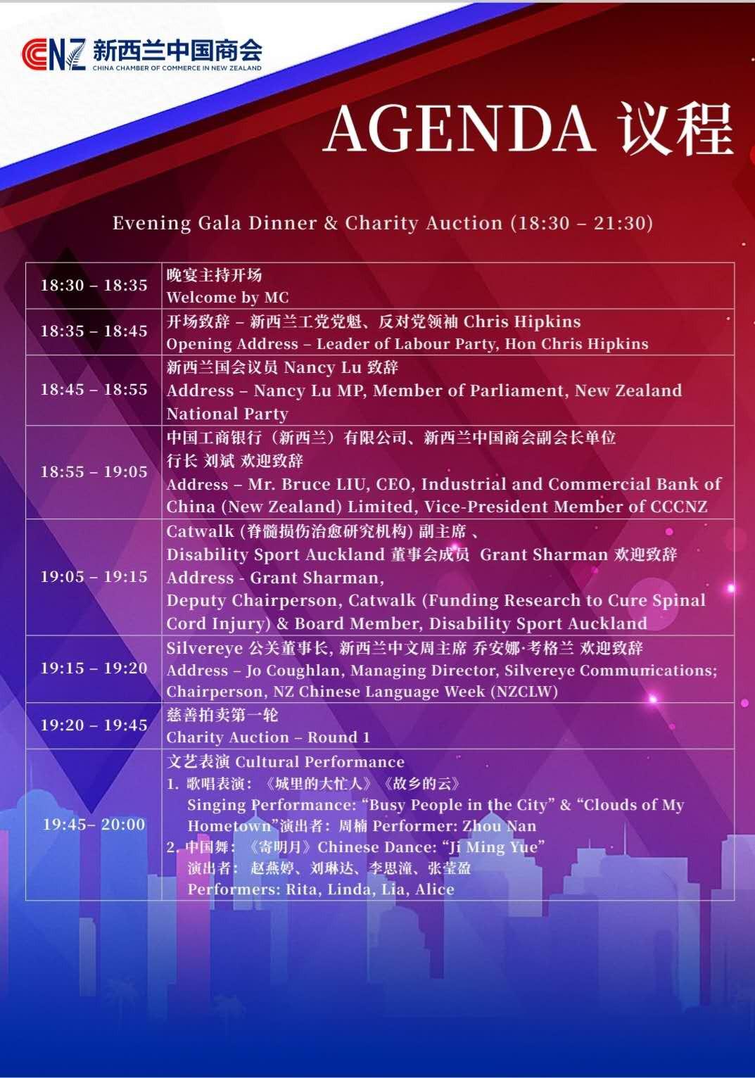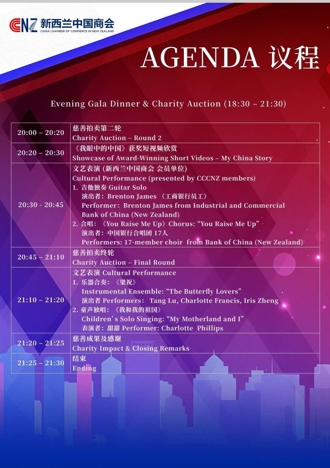 The Vision 2026 Gala Dinner (18:30–21:30) brings together government leaders, business executives, community organisations, and CCCNZ members for an evening of celebration, charity, and cultural exchange. The programme includes official addresses, charity auction rounds, and performances presented by the Chinese and New Zealand communities.